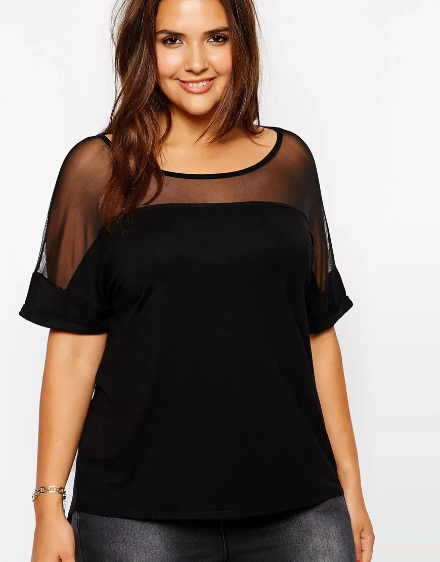 Plus Size Summer Casual Top Women Mesh Patchwork Short Sleeve Black Loose T-shirt Tee Female Plus Size Women Clothing 6XL 7XL 8X